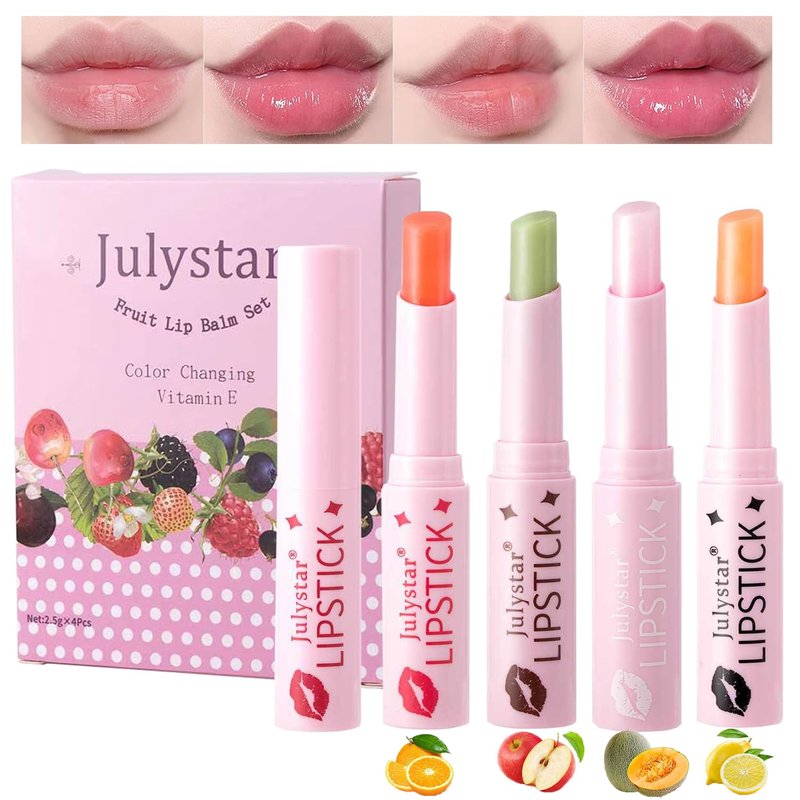 YIBABY 4 Pcs Fruity Colour Changing Lipstick, Moisturizing and Long Lasting Lip Balm with Vitamin E, Hydration, Lightweight Texture, Tinted Lip Balm with Gift Box for Girls and Women (B, 4 PCS)