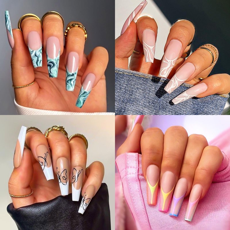 Soft gel nail tips includes seven different nail styles: Long Stiletto, Medium Stiletto, Long Coffin, Medium Coffin (Includes two styles), Oval Medium Almond, Oval Short Almond.