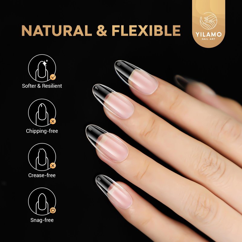 Yilamo's nail tips are made of a new soft gelly material, which is thinner, lighter, more durable, and more natural than traditional nail tips, which are naturally curved for a better fit. In addition, the gel material ensures that the product is flexible and can be bent without leaving a mark.
