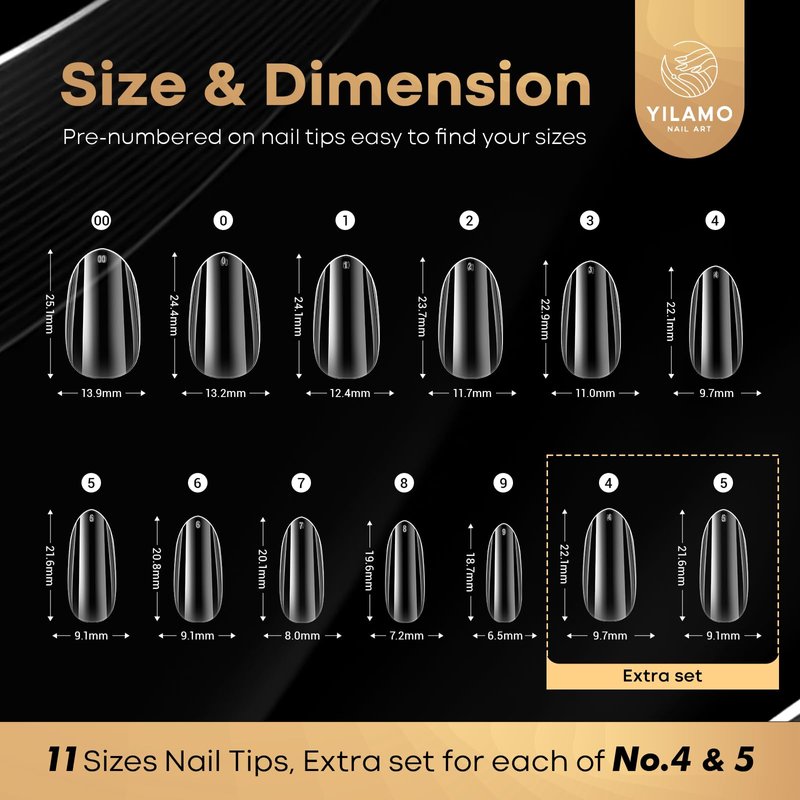 - [11 Sizes Available]: Our acrylic nail tips for extensions almond shape has 11 sizes, 40 pcs for each size (extra set for each of No.4 & 5), 520 pcs in total. the top of the acrylic nail tips are labeled with the size number, which makes it easy to pick the right one for your nails