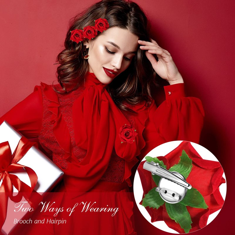 - Handmade and Beautiful: the red roses of the hair clips are made of bright colored polyester, which can serve as hair accessories as well as brooches, same accessory, different functions; Each flower is handmade, so each one is beautiful in a different way