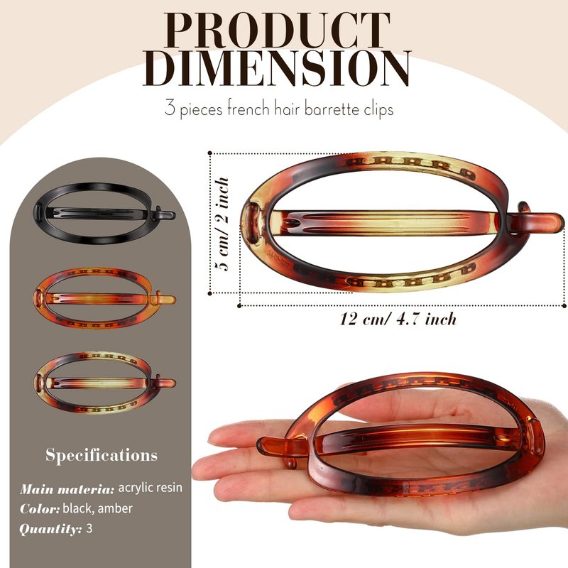 Yilloog 3 Pieces French Hair Barrette Clip French Clips Flexible Ponytail Holder Plain Strong Grip Closure Barrettes Styling No Metal Hair Accessories for Women Girls, 3 Colors (Oval Shape)