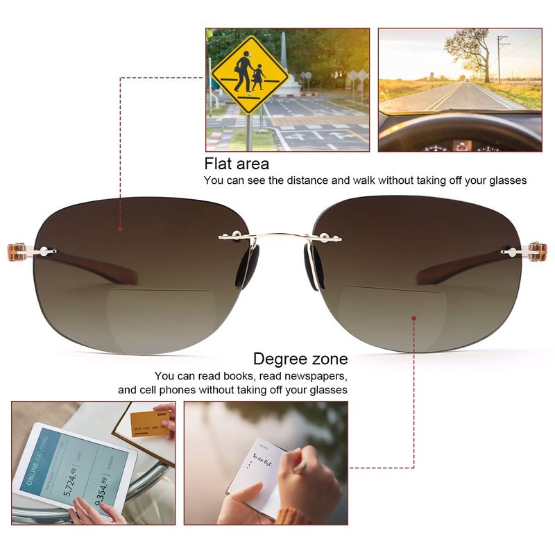 - Rimless Bifocal Reading Sunglasses - The Bifocal Reading Sunglasses has two visual areas. The top area is for distant vision. You can see the distance directly without having to remove your specs. The lower area is powered and convenient for reading indoors and outdoors. Perfect for outdoor reading and distance Viewing.