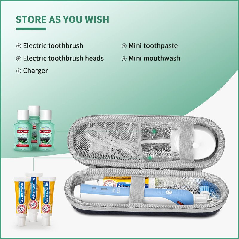 - 【CONVENIENT STORAGE】 Professional storage design, built-in hard inner tank for different models of the toothbrush body and toothbrush head, and the mesh zipper pocket with strap inside for easy placement of charging base, other replacement brush heads and so on.