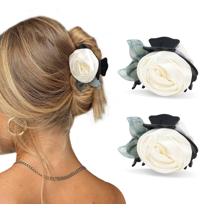 YISSION 2Pcs Flower Hair Claw Clips for Women Girls Rose Flower Hair Clip White Flower Claw Clips Medium Jaw Clips for Thin Thick Hair Cute Flower Hair Accessories for Women Girls