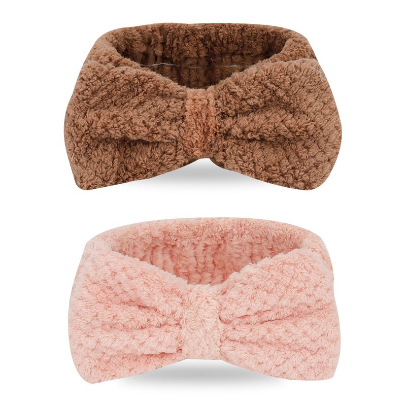 YISSION 2PCS Spa Headband with Bow No Slip Head Band for Face Wash Makeup Skincare Facial Headband Elastic Hair Band Microfiber Headbands for Women Girls (Pink Brown)