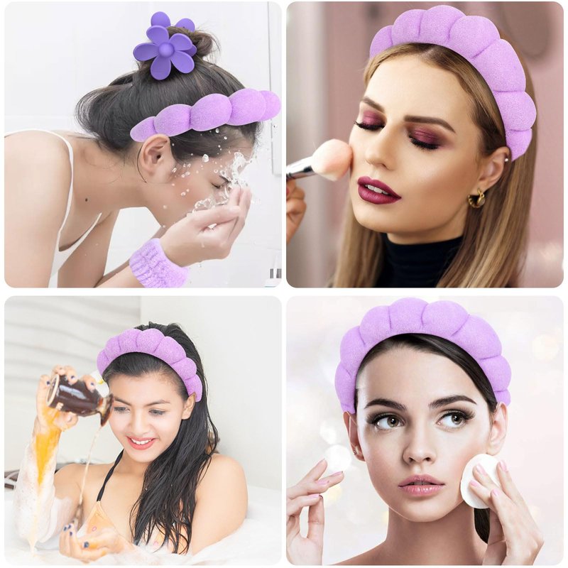 YISSION Purple Spa Headband & Wristband Set Skincare Headband & Wrist Bands for Washing Face Makeup Silk Hair Scrunchies Flower Hair Claw Clips Sponge Facial headband & wrist towels for Women Girls