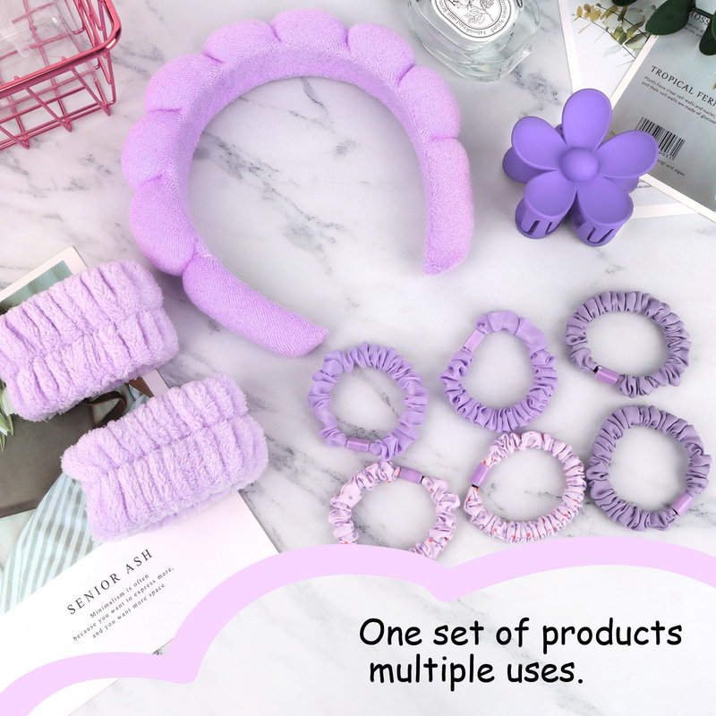 - Multiple Types of Products: 1 spa headband, 2 face washing wristbands, 6 Silk Hair Scrunchies and 1 flower claw clips. Multi-functional products for every occasion in life.