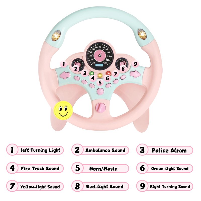 - QUALITY & SAFETY GUARANTEED: The toy steering wheel for car is made of high quality plastic. Polished and smooth without burrs, sturdy and durable, not easy to damage, can be used for a long time, odorless and non-toxic. The sound is gentle and the light is soft, protect your child's ears and eyes, absolutely safe for your kids
