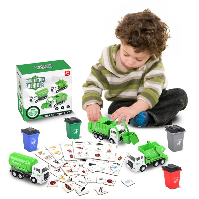 - 【MULTI-FUNCTIONAL GARBAGE TRUCK TOY PLAYSET】This garbage truck toy playsets include: Garbage trucks×1, water tankers×1, Dumper truck×1, 4 Color Printed Trash Bins (Recyclable, Kitchen Waste, Harmful Refuse, Other Garbage), with 108 pcs Mini Trash Learning Cards. The parts on the vehicle can be lifted, rotated and dumped to improve the playability. Products rely on Friction Powered to move, do not need batteries. The "trash" items are a cute extra and great for teaching kids how to sort trash as their gets older (recycle, trash, compost).This garbage game will keep your kids busy for hours.