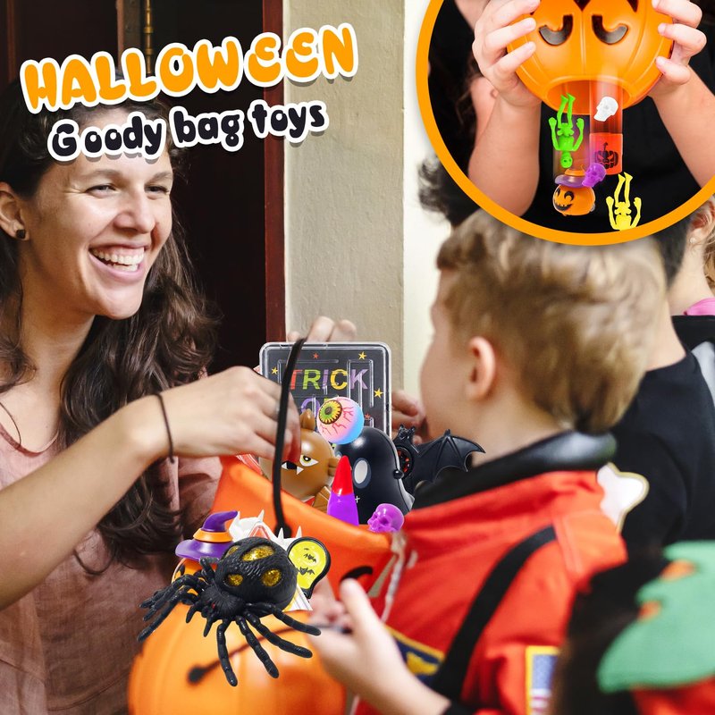 - Products Include: Such as Halloween fidget poppers*5(Pumpkin, Ghost, The bat,The cat),Halloween fidget pop keychain toys*3,Plastic tooth toys*5,Mochi squishy*4,Spider squishies ball*1,Spider maze*4,Tumblers*4,Stickers*100,Pull back car*4,Slap bracelet*5,Whistle*5,Stamp*4,etc