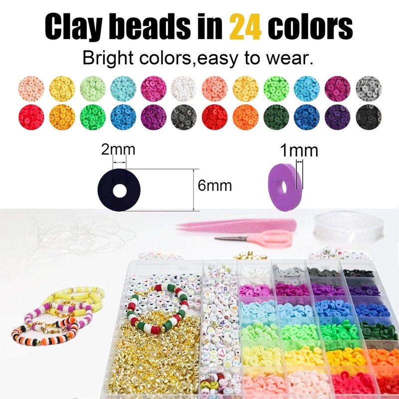 - Minimum age: Over 3 years old,Children need to be accompanied by an adult.Clay Beads 6mm in dia. and 1mm thick.Alphabet beads measure 6mm. and 4mm thick.Gold accessories measure approximately 5-6mm.We come with a large variety of accessories, enough to make multiple bracelets as well as necklaces.