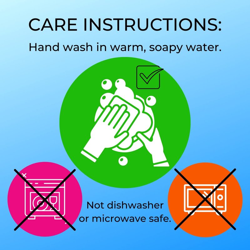 Your water bottle should be hand washed with a mild detergent and soft cloth or sponge to minimize scratching. Do not soak or place your bottle in the dishwasher.