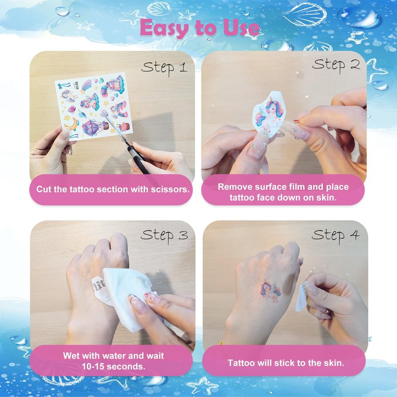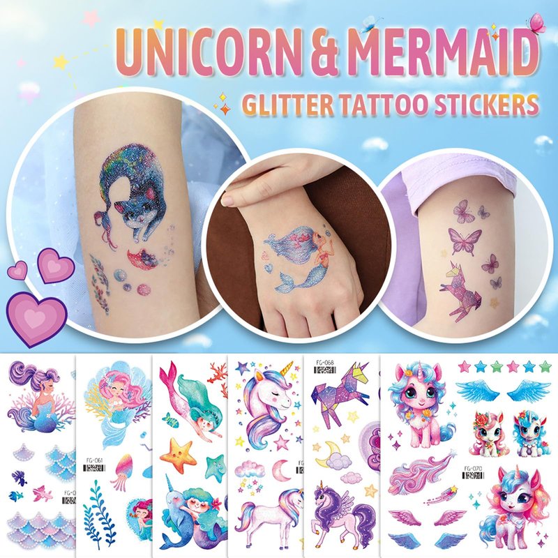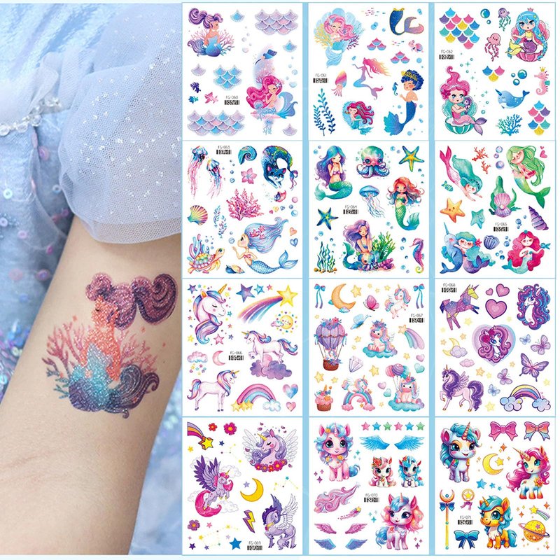 - Mixed Styles Temporary Tattoos for Kids:With over 240 Styles of temporary tattoos featuring a sparkly glitter style, these assorted tattoo stickers come in various designs, perfect for girls' favor. From unicorns, mermaids, butterflies, and flowers, to vibrant designs like pearls, starfish, jellyfish, half-mermaids, seaweed, and shells, they feature many of little girls' favorite characters. They make for great fun at a butterfly theme party or as spring-summer activity favors