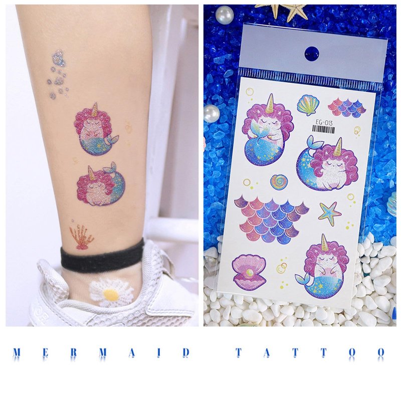 - Mixed Styles Glitter Tattoos for Kids: Even at a party with lots of friends, the tattoos will make you stand out in the crowd! The assortment includes mermaids, butterflies, dinosaurs, fairies, pandas, sea creatures, as well as vibrant designs like pearls, half mermaids, seaweed, shells, and more of little girls' favorite characters
