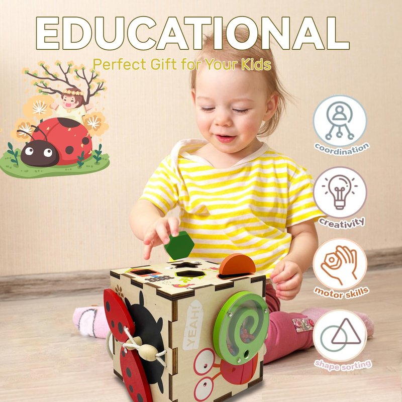 YODIFFMI Wooden Activity Cube Montessori Toys for 3 Year Old Baby Toys Toddlers Birthday Gift Boys Girls Sensory Interactive Learning Toys (Ladybugs)