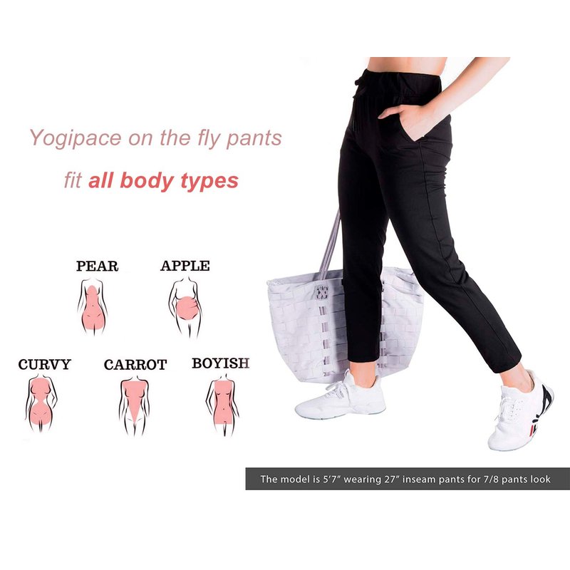 - Tapered-leg design to slim your silhouette. Tall or petite, slender or plus-size, Yogipace on the fly pants are a winner for every body type (pear,apple,curvy,carrot,boyish)