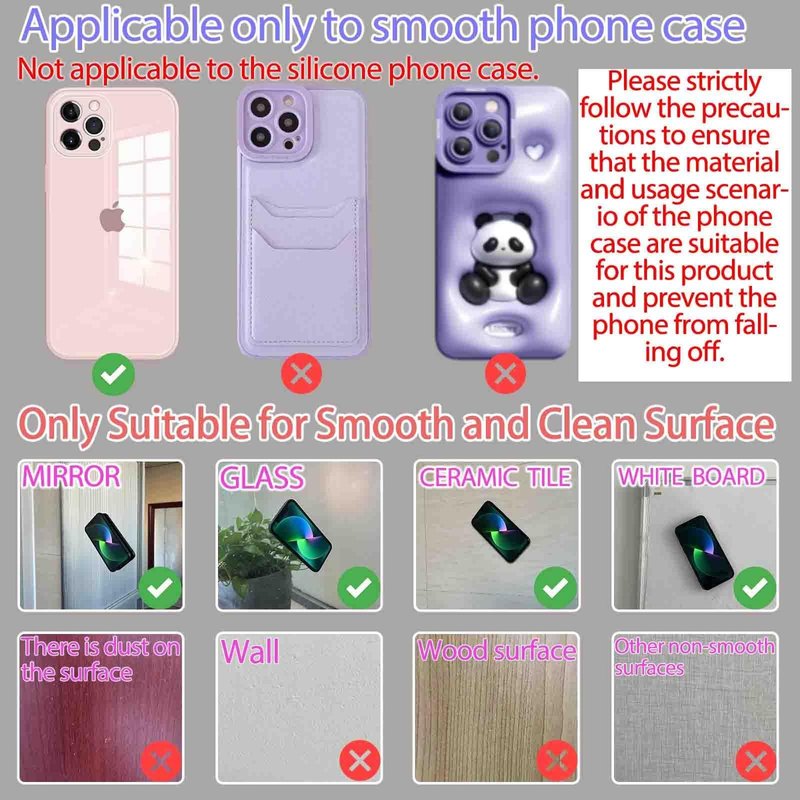5. 【Note】You can attach the suction cup phone mount to a smooth surface such as a mirror or glass. Before releasing your hand, make sure the phone is firmly adheres.The adsorption time is related to the smoothness of the surface of the adsorbing object, and the effect of adsorption on mirrors and glasses is the best.The suction power of the suction cup phone mount will gradually weaken over time. It is recommended to use it for a maximum of half an hour at a time to prevent the phone from falling.