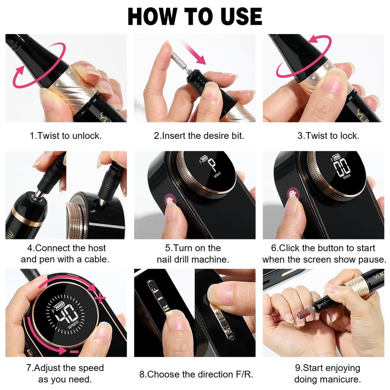 - [HD LCD Display]: Equipped with touch-sensitive buttons are integrated with the body of the efile nail drill, it is very easy and convenient to use. The smart LCD Display show clearly RPM and accurate battery for you.
