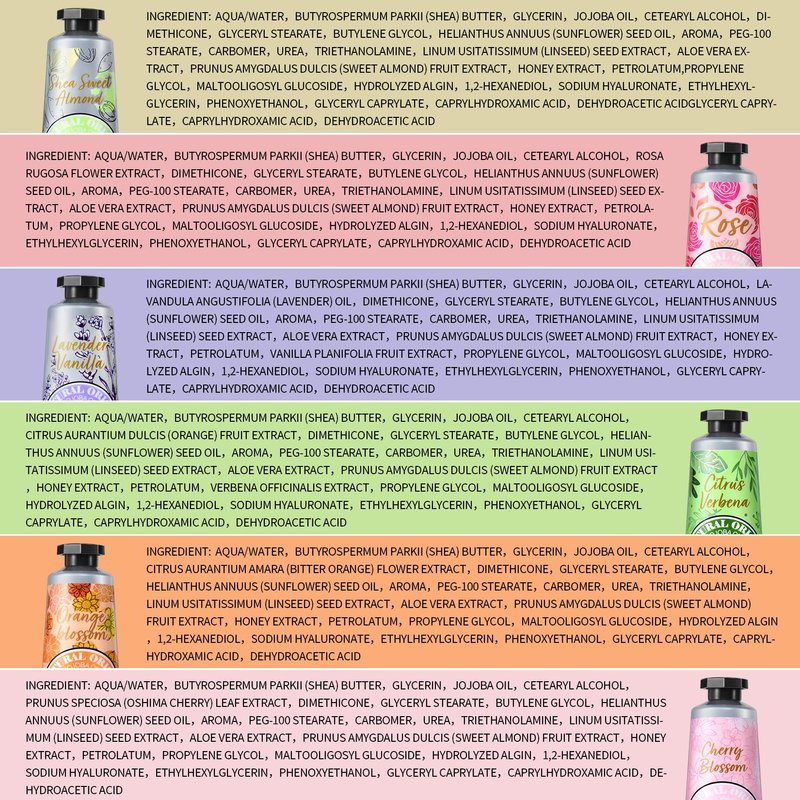 - 6 PLANT FRAGRANCE: A vibrant 6 of plant & floral scented from natural origin, includes 1x Rose Hand Cream, 1x Lavender Hand Cream, 1x Shea Almond Hand Cream, 1x Orange Blossom Hand Cream, 1x Cherry Blossom Hand Cream, 1x Citrus Verbena Hand Cream.