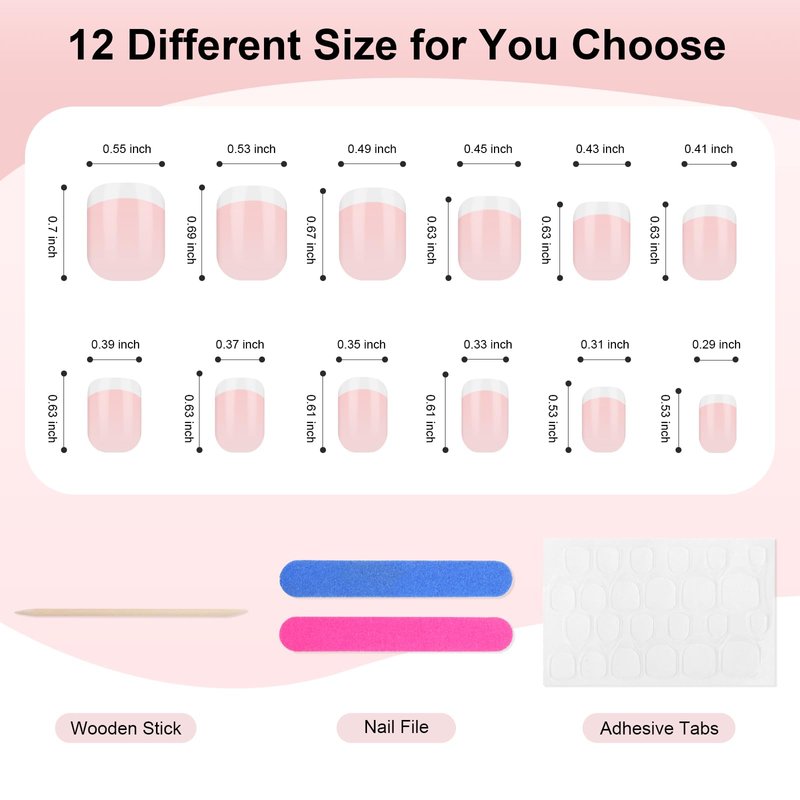 - 【12 Different Size to Choose】: Our press on nails french tip are available in 12 different sizes, catering to people with different nail sizes. After you've picked out your appropriate nail size, simply use adhesive tabs to attach it to it!