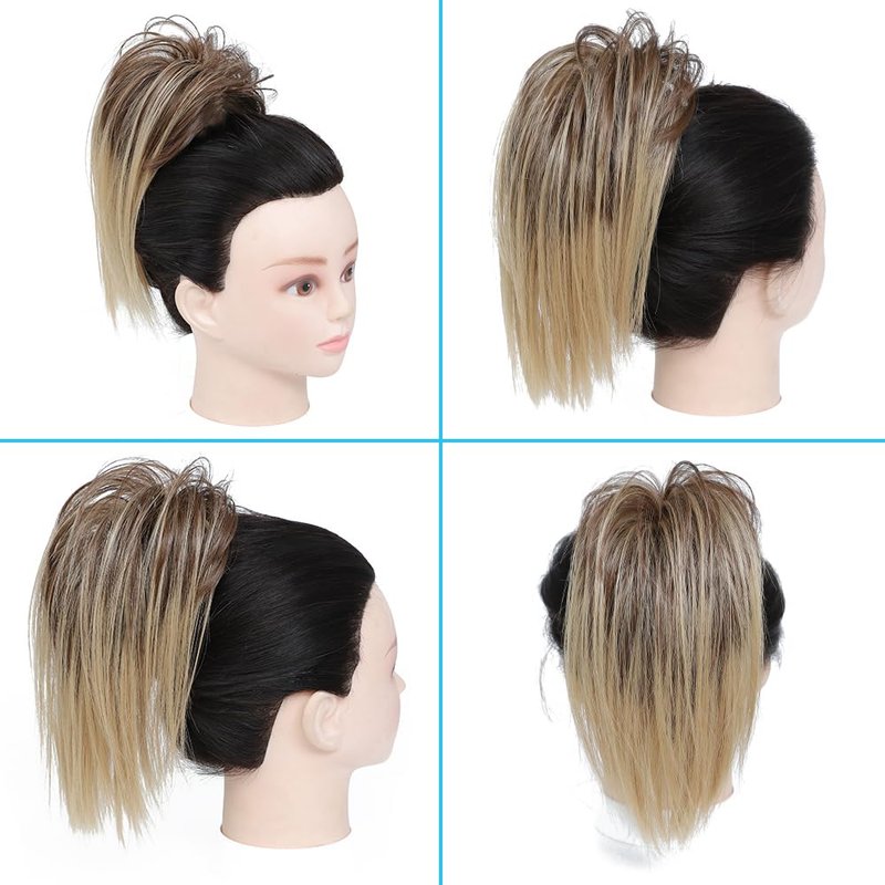 YOLANFAIRY Messy Bun Hair Piece Claw Clip in Hair Buns Hair Piece for Women Straight Short High Ponytail Extension Tousled Updo Faux Hair Bun Scrunchies for Girls (Brown Mix Ash Blonde)
