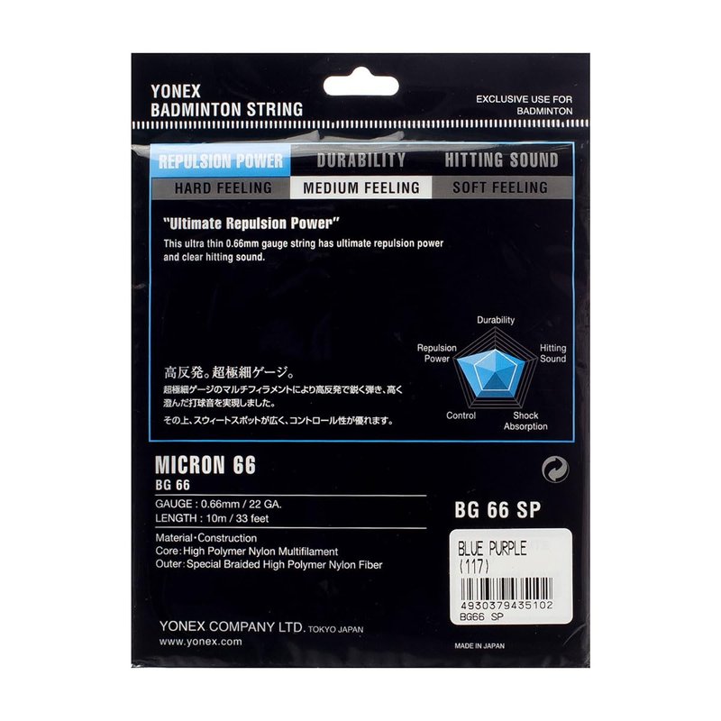 - Yonex BG-66 badminton string is an ultra-thin gauge string has ultimate repulsion and clear hitting sound.