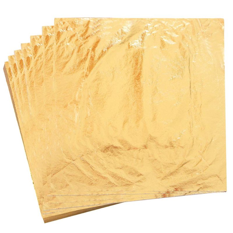 - √100 pieces 14cm x 14cm gold foil, made from 86% copper and 14% zinc, These imitation gold foils are loose leafed, with each sheet sandwiched between tissue-like paper sheets. To use, gently lift a tissue paper and grasp the sheet underneath it. The imitation gold material, whose main component is copper, is perfect for restoring furniture into beautiful new-looking gold treasures at home. It can also be used to make your crafts more resplendent.non-edible,can't be used for cake baking