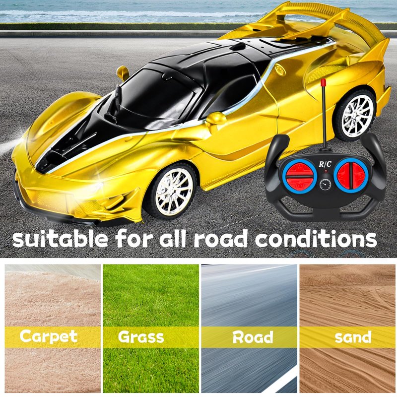 - Design Remote Contonl Car for Kids: This rc car has bright gold colors,LED light for boys girls make rc car more cute or cool!Realistic race looks, Can provided Super realistic driving experience for kids, We believe that every boys or girls would want to have a remote control car exclusively for oneself, as choose making perfect gifts for Birthday Christmas Car Toys for 3-7 Year old boys.
