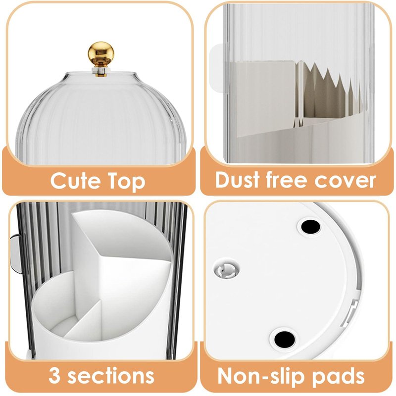 Take your makeup organization to the next level with our makeup brush holder. Say goodbye to cluttered vanities and drawers. Our product offers a 360° rotating base, a sliding door cover, and an acrylic cover that keeps out dust to keep your brushes clean and organized. The holder has 3 sections that are perfect for storing eyeliner, mascara, cosmetic tools, lip liners, and more! With easy access to all your tools, you'll never have to search for the right brush again. This sleek design is perfect for any dresser or vanity and makes a great gift for birthdays or Valentine's Day. Free up space in your bathroom or makeup area while keeping all of your beauty essentials in one place with our makeup brush holder.