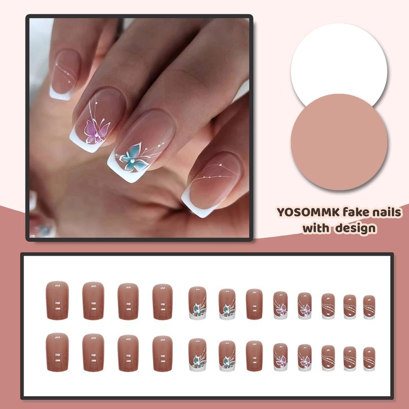 YOSOMMK Nude Press on Nails Short Square Fake Nails with Butterfly Designs French Tip Glue on Artificial Nails Glossy Stick on False Nails for Women and Girls