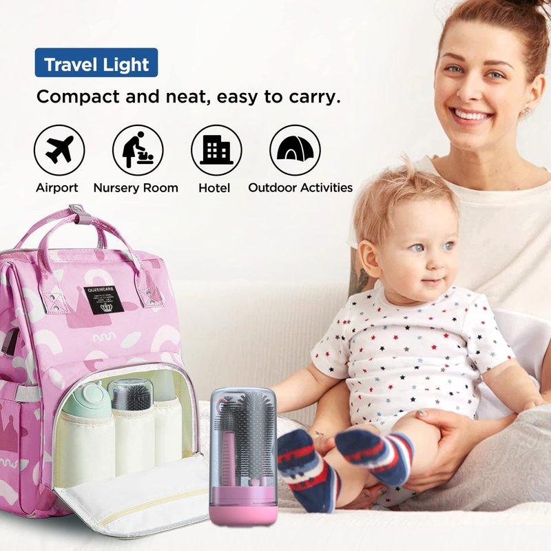This travel baby bottle brush set is designed for parents who travel with a baby to clean and dry baby bottles.
