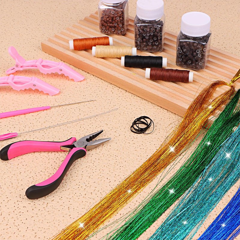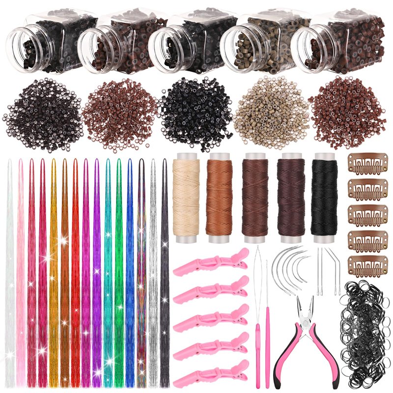 - 【Hair Extension Tinsel Kit】You will receive a set of hair extensions including: 2500pcs silicone lined micro rings (500pcs in black, dark brown, brown, light brown and beige), 15pcs metal hair wires in different colors, 1 pair of pliers, 1 pair of threader, 1 pair of crochet hook, 10pcs C/J/I needles, 5pcs hairpins, 5 rolls of sewing thread, 5pcs BB clips and 500pcs black rubber bands; this set of hair extensions can meet your daily hair styling needs.