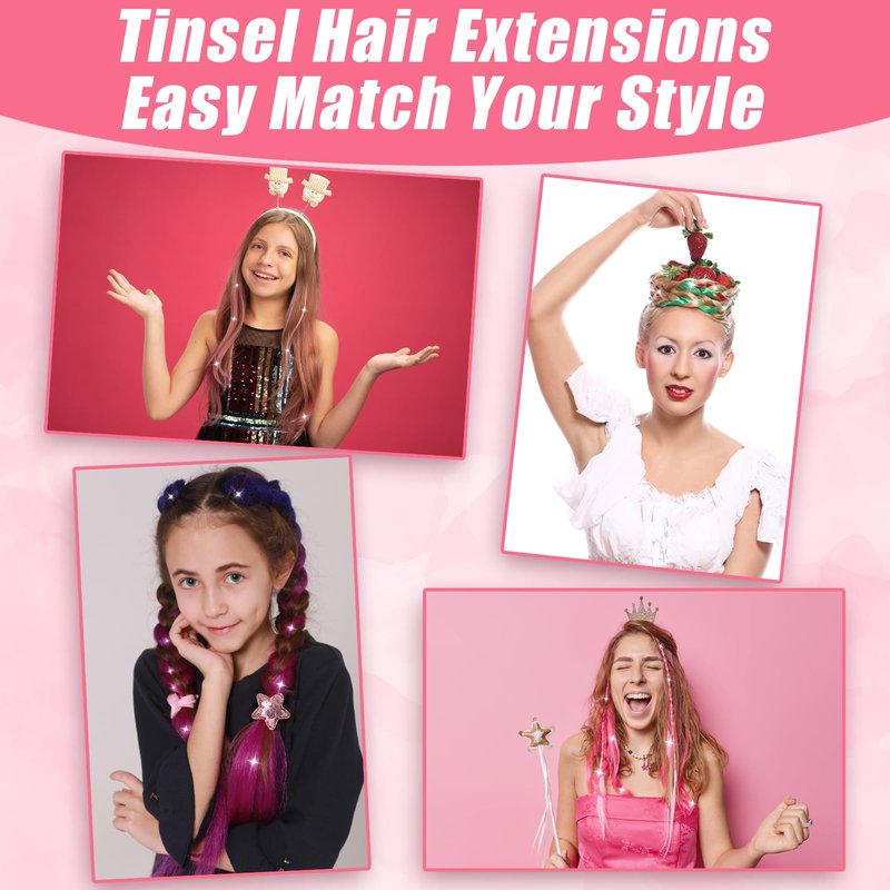 - 【Fairy Hair Tinsel Colors】Our hair extensions are available in 15 different colors, including tri-color, albumen pink, pink, rose red, gold, bronze, bright red, amaranth, purple, peacock blue, green, royal blue, sliver,black. multicolor. Made of 100% high-quality polyester hair, it is safe, heat-resistant, odorless and will not fade. It can be washed, blow-dried, straightened, ironed or combed.