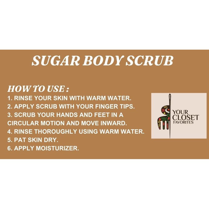 - BENEFITS: Our Sugar body scrub removes dead skin cells from skin surface. By regularly using our Body Sugar Scrub, you’ll unclog your pores, which can prevent razor bumps and ingrown hairs. Help the skin to absorb skin care products. Our Sugar Body Scrub encourage the healthy rejuvenation of skin, making it look fresh and velvety soft. It also help promote blood circulation to keep the skin looking healthy and retain its elasticity.