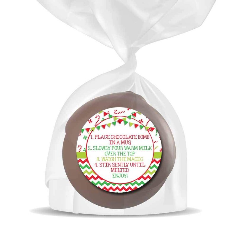 - 2 inch circle labels are perfect for hot chocolate bomb gift packaging. You’ll get 20 sets of 2 stickers each so there’s plenty to go around. Stick them on your goodie bags – 1 decorative sticker on the front of the package, 1 instructional sticker on the back!