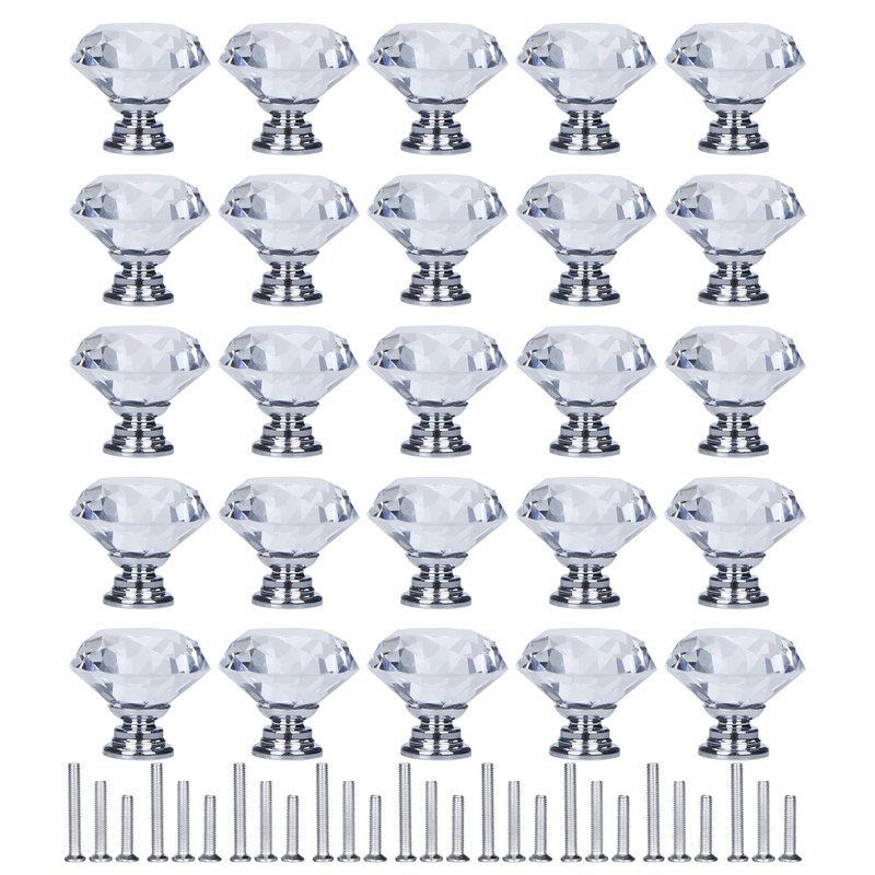 Specification: Material: Crystal glass and aluminum alloy Crystal diameter: Approx 1.18inch (30mm) Base diameter: 0.7inch (18mm) Total height: Approx 1.18inch (30mm) Screws: 30 pack 4*20mm; 30 pack 4*25mm; 30 pack 4*35mm Shape: diamond shaped Base color: Silver Easy Installation: Find the position where you want to install on the board and drill a hole. Then pass through the screw from the back of board and thread tight to the knob. Application: The crystal knob is very pretty artistic and durable, Ideal for cabinet, dresser, drawers, cupboards, wardrobes, bookcase in your home, kitchen, bathroom, living-room, book-room, dorm and office. Best for decoration. Package Includes: 30 * Silver knobs 90 * Screws(0.79inch /0.98inch /1.38inch, each size 30 pack)