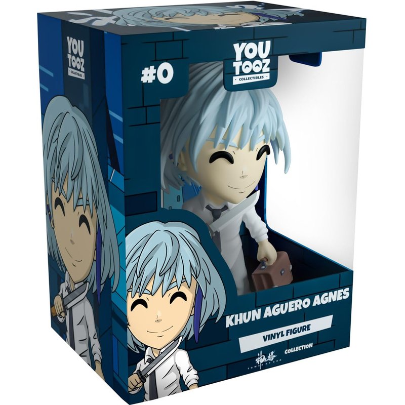 - Youtooz Khun Aguero Agnes Vinyl Figure: Khun stands at 4.6 inches tall, wearing his iconic white dress shirt with his black tie, ready to take on the tower. He is seen holding his trusty briefcase in one hand with a dagger in the other. He has a confident grin on his face, knowing just how strong he is.