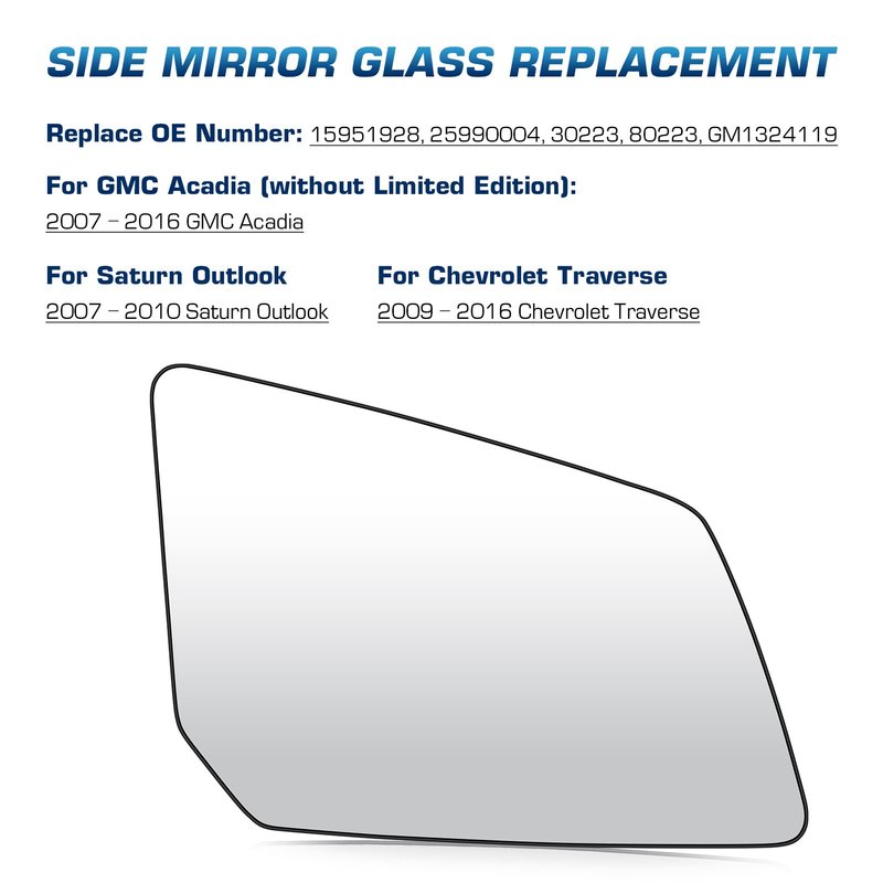 - 🚘【COMPATIBLE WITH】: Youxmoto Passenger Right side heated mirror glass replacement for Saturn Outlook 2007-2010. Chevrolet Traverse 2009-2016. GMC Acadia 2007 2008 2009 2010 2011 2012 2013 2014 2015 2016.