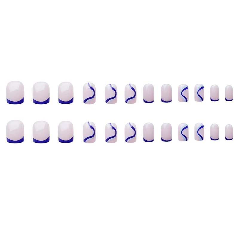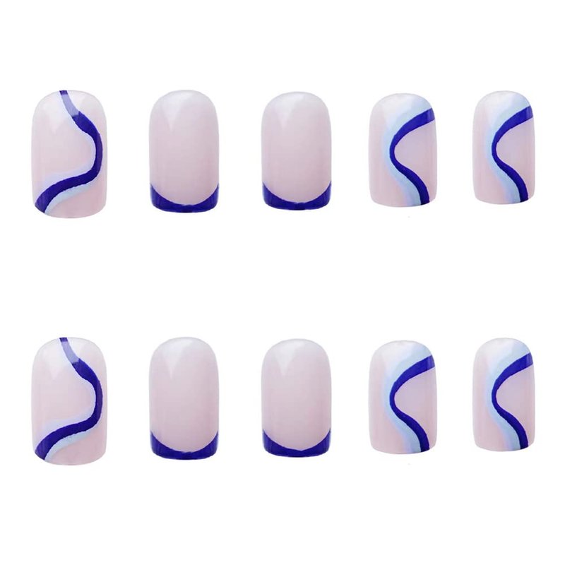 YoYoee Short Square Press on Nails French False Nails Acrylic Full Cover Glossy Fake Nails Blue Swirl Tips for Women and Girls 24PCS