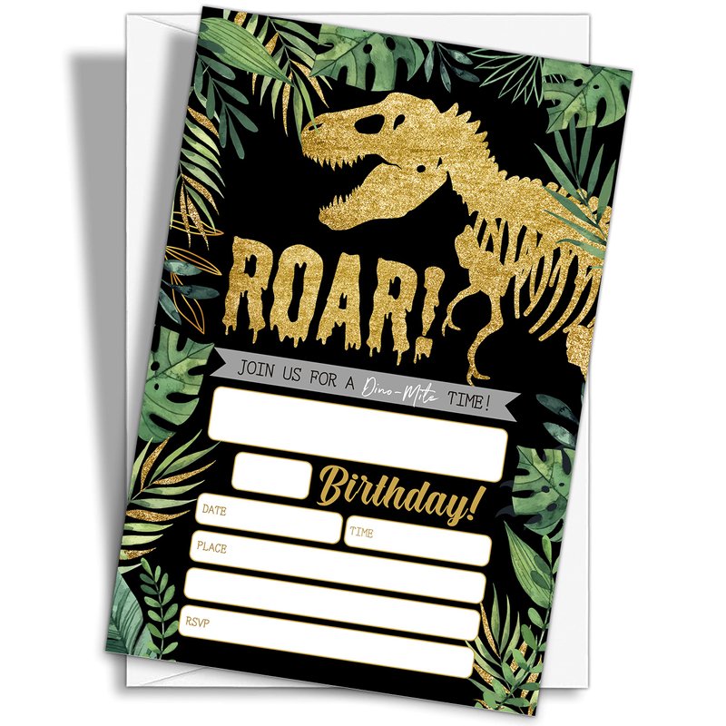 YQV Gold Dinosaur Birthday Party Invitations, 20-Count Jungle Birthday Party Invites With Envelopes-HBYQK-B44