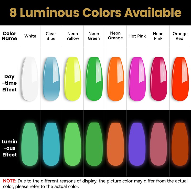 - 🎃➊【GLOW IN DARK & NEON 2-IN-1 GEL POLISH】The bright and lively color can be used as a normal solid color gel polish for daily life and work,but also can be used in the evening to go to parties,Halloween and other celebrations,making you the focus of the crowd,the style and shape is interesting and versatile,will definitely bring you a surprise and a good experience.Need to shine under the light for at least 60 seconds before presenting the glow in the dark effect.