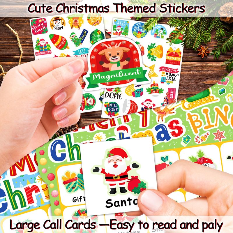 - Package include: The Christmas bingo game set include: reusable storage box and bag, 24 pcs different player Christmas bingo cards, 26 pcs well-designed calling cards, 480pcs marking cards and 40 pcs unique Christmas stickers