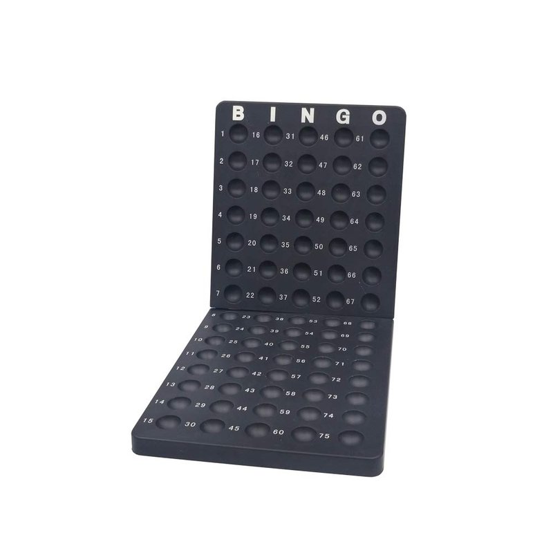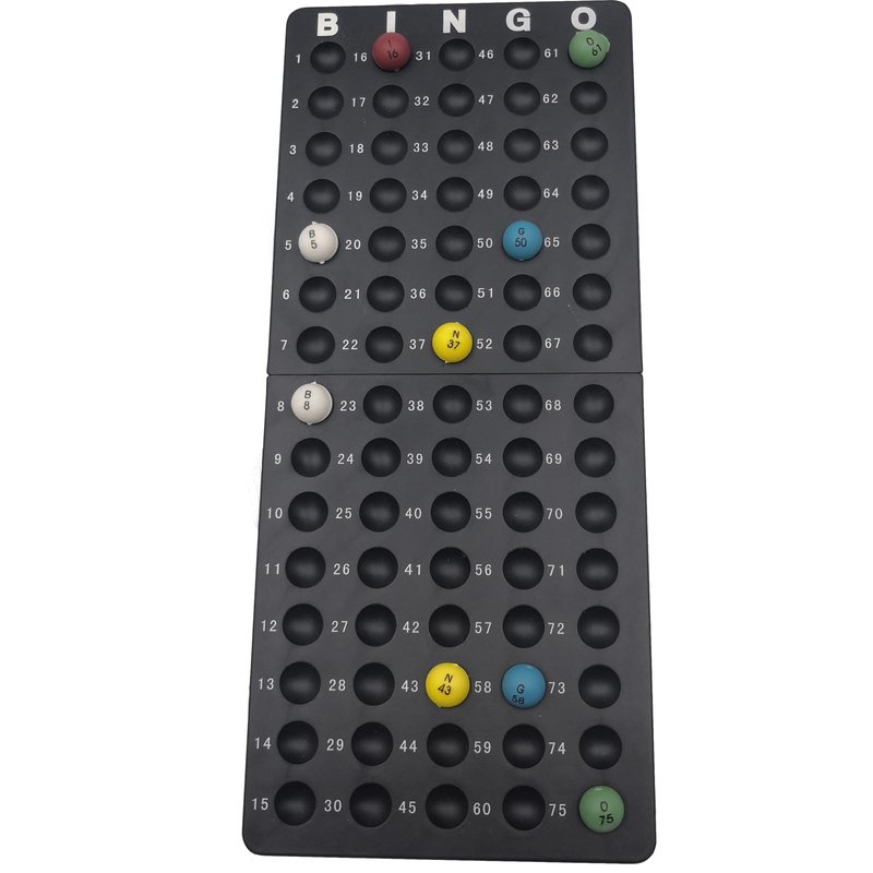 - Holds a total of 75 balls. Easy to place bingo balls on the bingo board, the main board is black to contrast with the balls. Lettering on the board is clear and easy to read.Bingo callers can effortlessly call and track their bingo numbers with this bingo board.