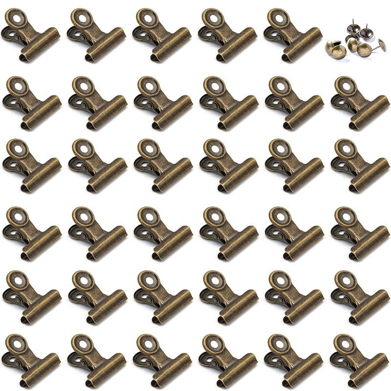 YUCHIYA 32 Pack Metal Clips with 32 Push-pins for Corkboard,Bulldog Clips for Hanging Pictures,Small Hinge Clips for Photos Crafts,Mini Binder Clips Paper File Clamps for Office School(1 Inch,Bronze)