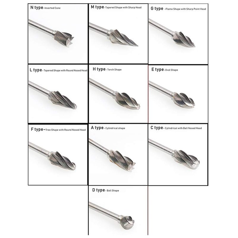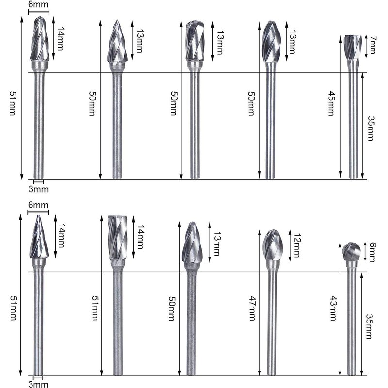 - 【Excellent Tungsten Carbide】:Made of heat-treated 100% raw material, long life and high durability. 10pcs Carbide Rotary Burr Set about 6mm Cut Dia, 3mm(1/8 inch) Shank, total length: approx. 45-50 mm fits dremel and most small rotary tools. Different shapes to meet your various needs.