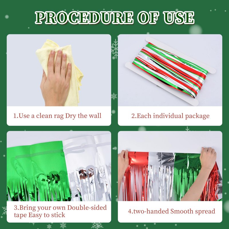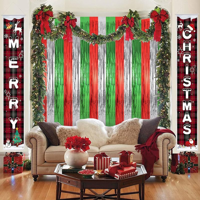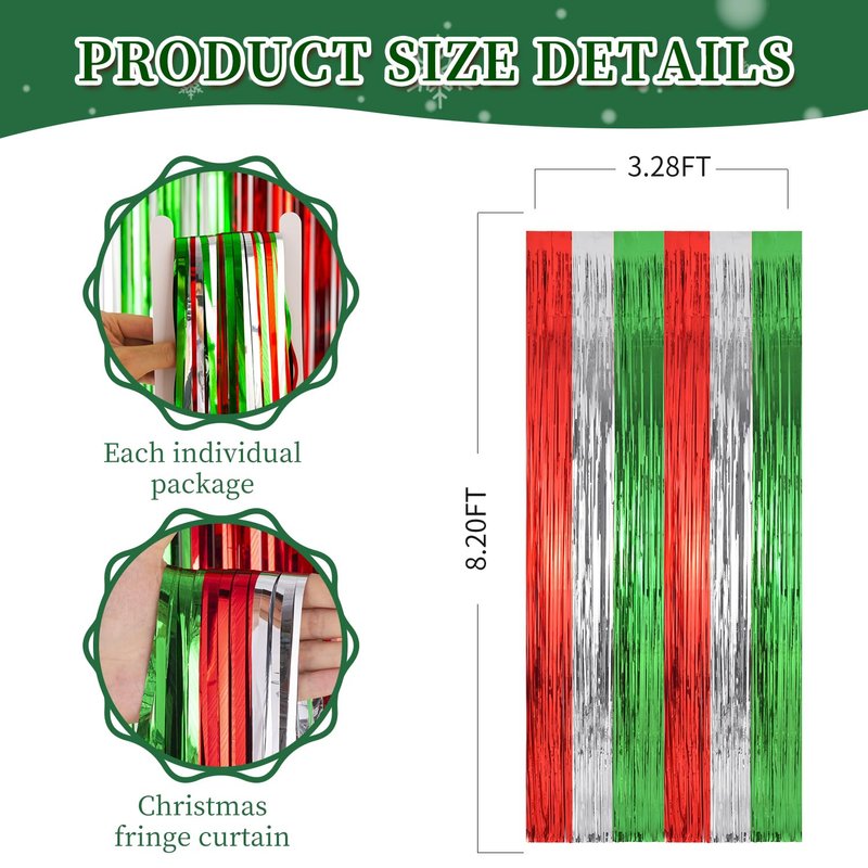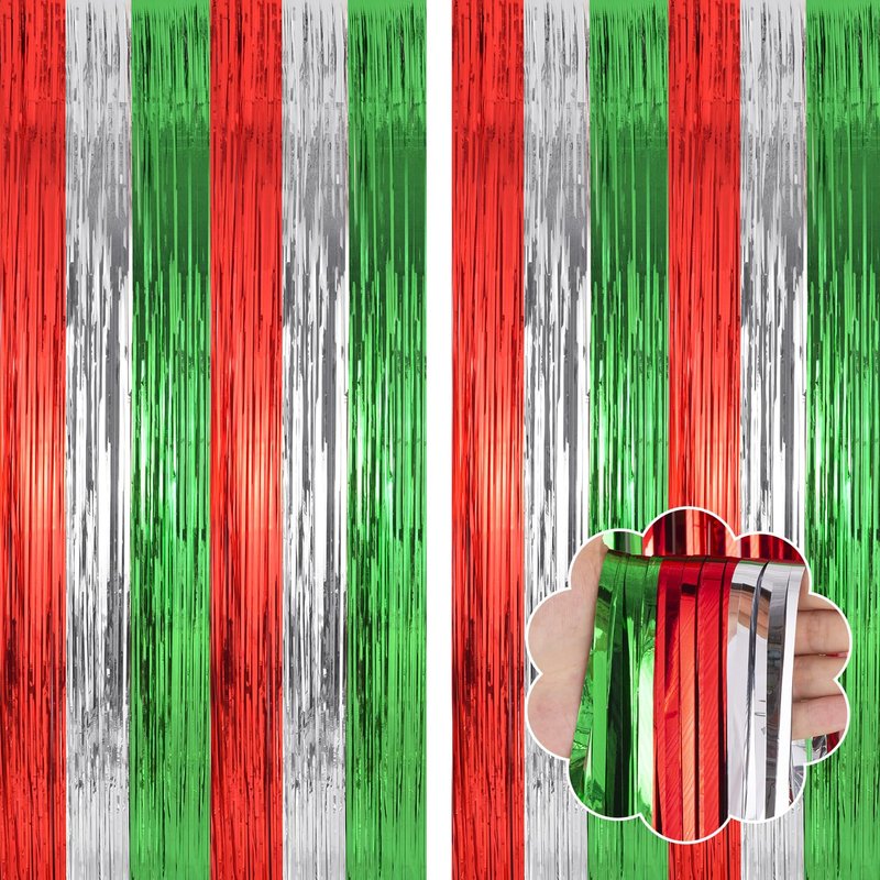 - ๐Widely Applications๐ : These red green silver foil fringe curtains backdrop are a wonderful finishing touch for any party such as a christmas carnival party, new year's eve party, friendsmas party, ugly sweater party, birthday party, anniversary party, wedding party, engagement party, graduation party decorations, they are also suitable for photo backdrop, stage background, disco, baby shower, bridal shower, etc.