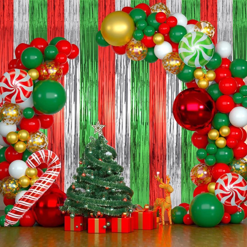 - ๐You'll get๐: Christmas streamers party decorations includes 2 red green silver curtains and 40 capsules glue dots. Each foil curtain backdrop are 3.28ft*8.2ft, providing ample length for christmas party decorations.