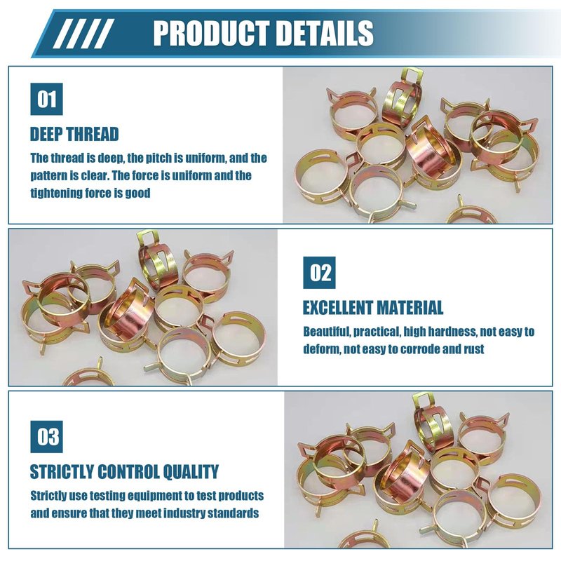- Elastic Design: The hose clamp adopts an elastic design, which can adapt to various pipe diameters and shapes, and the connection is stable and reliable. It can be widely used in welding, processing, installation and other industries, such as fuel hoses, ventilation pipes, poles, etc.