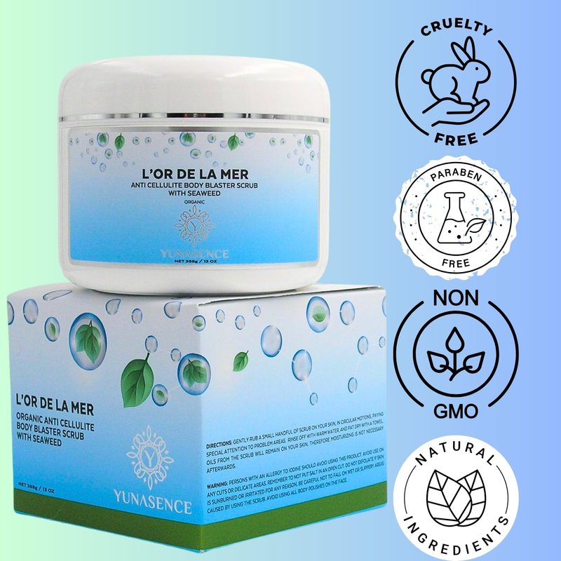 YUNASENCE L'OR DE LA MER Organic Anti Cellulite Body Blaster Scrub with Sea Salt, Seaweed, Lemongrass 13oz Smoothing Exfoliating Moisturizing Skin Massage Treatment.